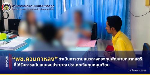 นายเจนต์วิทย์ นาคแท้ ผู้อำนวยการกลุ่มงานส่งเสริมการพัฒนาชุมชน รักษาราชการแทนพัฒนาการอำเภอควนกาหลง มอบหมายนายอนุวัฒน์ นิ่มมา พัฒนากรผู้รับผิดชอบงานกองทุนพัฒนาบทบาทสตรี ดำเนินการตามแนวทางกองทุนพัฒนาบทบาทสตรีที่ได้รับการสนับสนุนงบประมาณ ประเภทเงินทุนหมุนเวียน